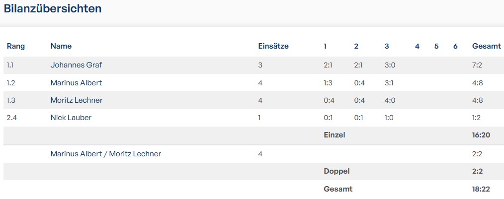 Durchweg spannende und knappe Spiele bestimmten die Halbsaison, wobei vor allem Johannes mit einer Bilanz von 7:2 heraussticht. Aber auch Marinus und Moritz konnten wichtige Punkte beisteuern, nicht nur im Einzel.