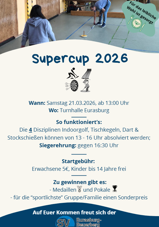 Am 7.3.2026 findet die Gemeindemeisterschaft des SV-Eurasburg-Beuerberg statt. Hier findet Ihr die Startliste für den Riesenslalom am Samstag: Startliste Riesenslalom Gemeindemeisterschaft 2026 Der/die Gemeindemeister/in wird