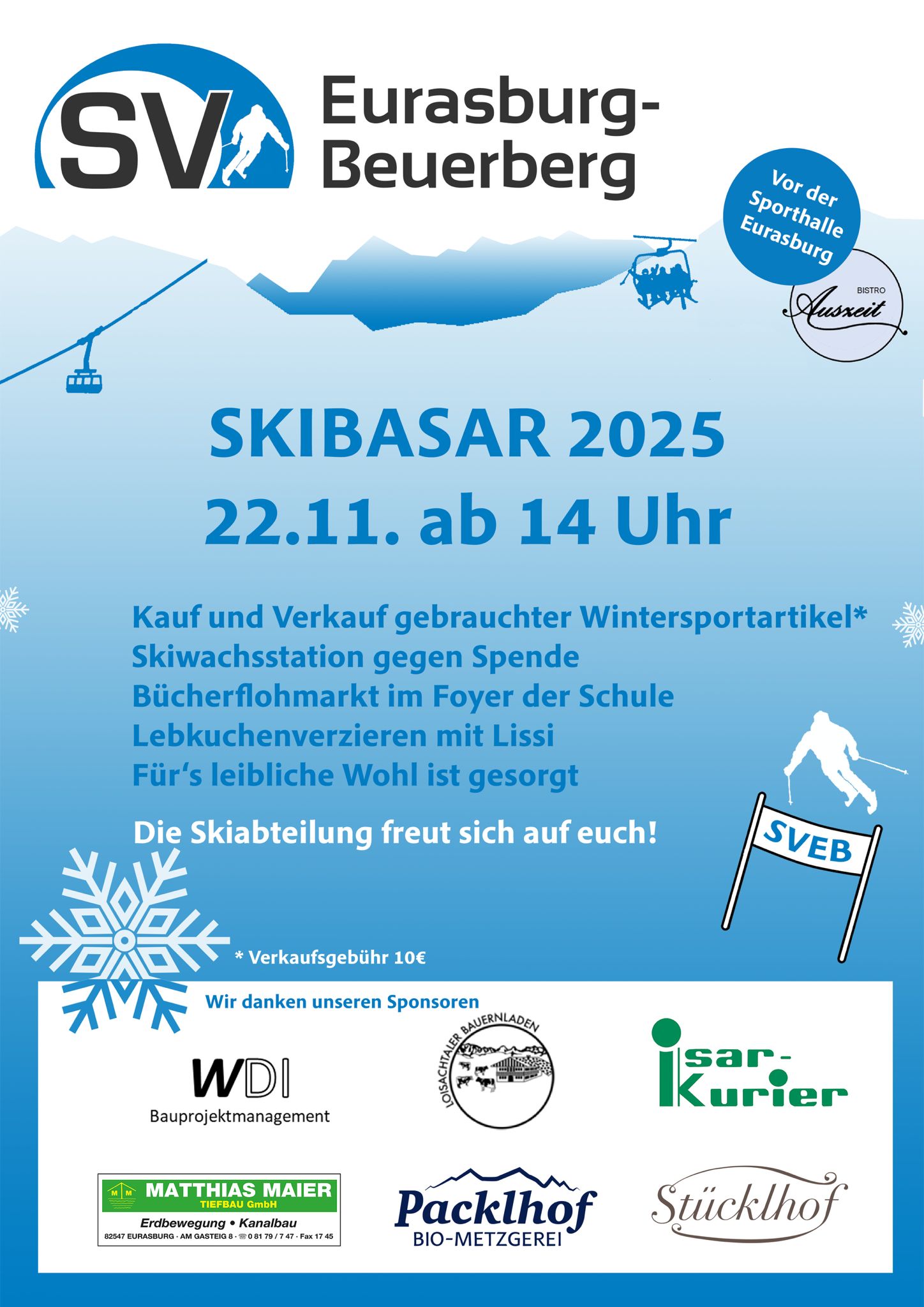 Am 22.11.2025 findet zur Einstimmung und Vorbereitung auf die Skisaison 2025/26 der Skibasar der Abteilung Ski des SV Eurasburg Beuerberg an der Sporthalle Eurasburg statt.